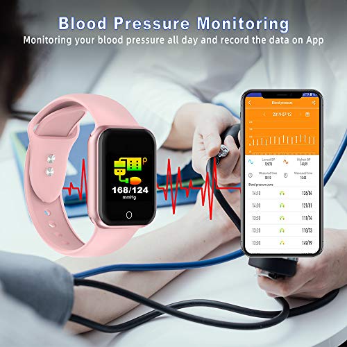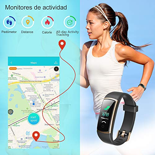 - [PRESIÓN DE LA SANGRE Y MONITOR DE LA FRECUENCIA CARDÍACA] Realice un seguimiento automático y preciso de su presión arterial y frecuencia cardíaca en tiempo real, preste atención a la calidad del sueño en el tiempo. Puede ver los datos actuales en los smartwatches y verificar los datos históricos en la aplicación. Además, el reloj de fitness también puede registrar los datos de pasos, distancia y consumo de calorías. Ayudarle a hacer el plan de ejercicios correcto y mejorar su estilo de vida.