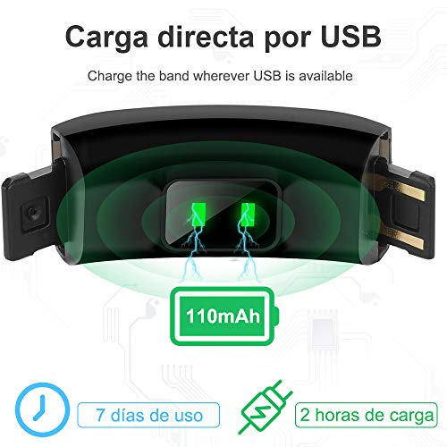 - 【Llamadas & Recordatorio de mensajes & Tiempo de espera largo】El rastreador de ejercicios vibrará para avisarte si tu teléfono recibe una llamada telefónica, mensajes de texto SMS y mensajes SNS, incluidos Facebook, Twitter, WhatsApp, Linkedin, Messenger, etc. Construido en una batería de 210mAh, el rastreador puede funcionar durante 10 días de manera continua y en espera durante 45 días después de 2,5 horas para la carga completa.