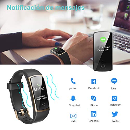 - 【Notificaciones inteligentes 】Conecte el rastreador de aptitud con su teléfono inteligente, nunca se perderá una llamada y un mensaje. Vibrará para avisarle si su teléfono recibe una llamada telefónica, mensajes de texto SMS y mensajes SNS como Facebook, Twitter, WhatsApp, Linkedin, Messenger, etc. Simplemente conecte la pulsera a su teléfono a través de Bluetooth y establezca en la aplicaci.