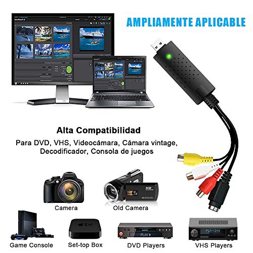 - Amplia Aplicación: con este capturador video, convertirá y digitalizará señales de música y video de manera conveniente o podrá conectar reproductores de DVD, grabadoras de video, videocámaras, cámaras digitales, old cámaras, sistemas de alta fidelidad u otros dispositivos AV con un conector compuesto (CVBS) o S-Video a través de este capturador a su PC.
