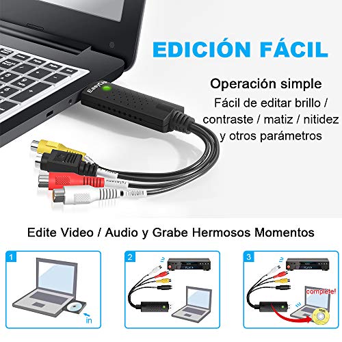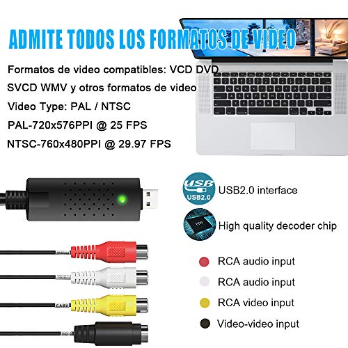 - Fácil de Operar: Entrada de video: conector S-Video (Mini-DIN 4) y conector compuesto CVBS. Entrada de audio: canal izquierdo (Audio-L) y canal derecho (Audio-R). Operación simple en PC y laptop.