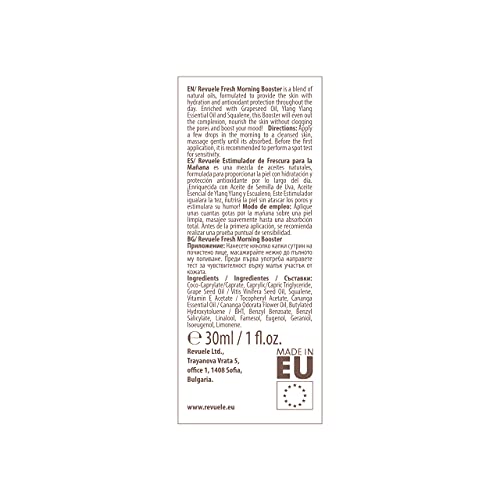 - REVUELE APOTHECHARY Fresh Morning Booster es una mezcla de aceites naturales, formulada para proporcionar a la piel hidratación y protección antioxidante durante todo el día.