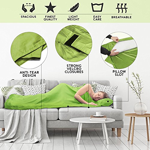 - EL SACO DE DORMIR NÚMERO 1 - Con funda para almohada y una bolsa para transportarlo. Su calidad extraordinaria, su tamaño compacto y sus características innovadoras hacen que este ligero saco de dormir para el verano sea el mejor del mercado y el mejor compañero para un viaje o una excursión. La funda para la almohada incorporada te ayudará a que la almohada se quede en su sitio.