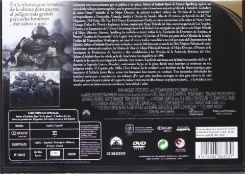 Aclamada internacionalmente por el público y la critica, Salvar al Soldado Ryan de Steven Spielberg supone un inolvidable hallazgo cinematográfico que ha provocado en todo el mundo un impacto profundo y duradero. Ganadora de cinco Oscar® incluído el de Mejor Director, la película también obtuvo los Premios de la Academia® correspondientes a Fotografía, Montaje, Sonido y Efectos de Sonido.