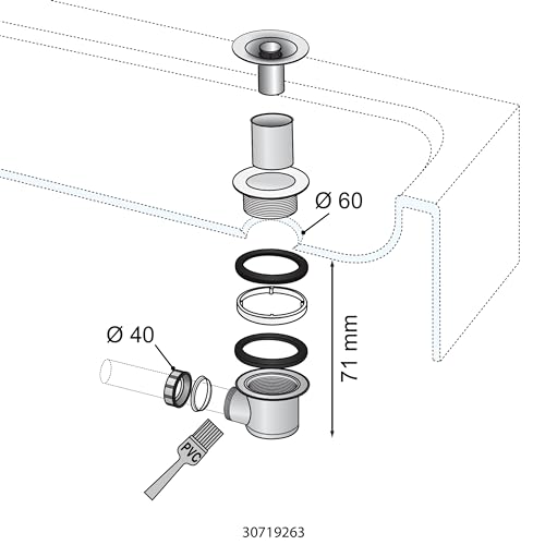 - Válvula de desagüe sifónica sin tapa con aro superior en acero inoxidable y fijación mediante 3 tornillos