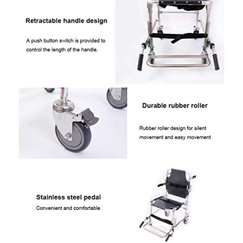 - Diseño especial: silla de escalera Diseñada con 2 ruedas delanteras adicionales para ayudar a transportar a los pacientes más fácilmente. Las cuatro ruedas permiten que los pacientes se muevan sobre la mayoría de las superficies con un esfuerzo mínimo.