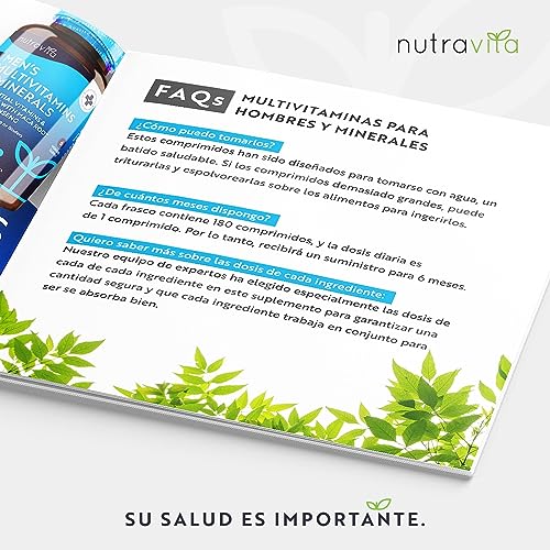 - ✔ ¿POR QUÉ EL SUPLEMENTO DE MULTIVITAMINAS Y MINERALES PARA HOMBRES DE NUTRAVITA? - Nuestras tabletas multivitamínicas para hombre contienen 25 vitaminas y minerales activos, incluida la Raíz de Maca y el Panax Ginseng. Estos ingredientes se han seleccionado cuidadosamente para ayudar especialmente a los hombres a diario. Recomendamos tomar una tableta por día, lo que significa que nuestro suplemento viene con un suministro de 6 meses de 180 tabletas aptas para veganos.