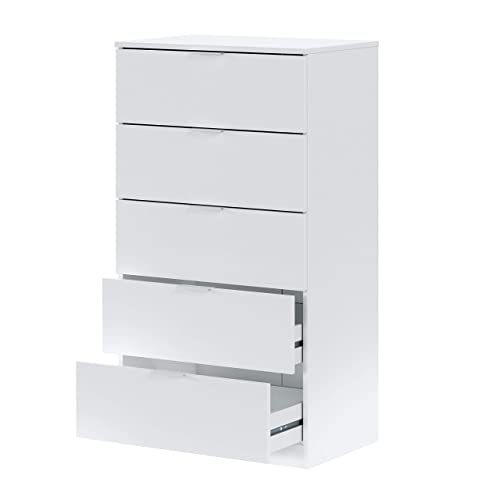 - Diese Hochkommode in anspruchsvollem Mattweiß verleiht Ihrer Inneneinrichtung eine elegante Note. Der Schrank ist aus Spanplatte gefertigt und besteht aus 5 Schubladen, die eine ideale Aufbewahrungslösung für Kleider und kleinere Artikel bieten. Im Lieferumfang enthalten sind auch zwei Wandanker, die das Umkippen verhindern. Zudem lässt sich dieser langlebige Lagerschrank ganz einfach reinigen sowie zusammenbauen.