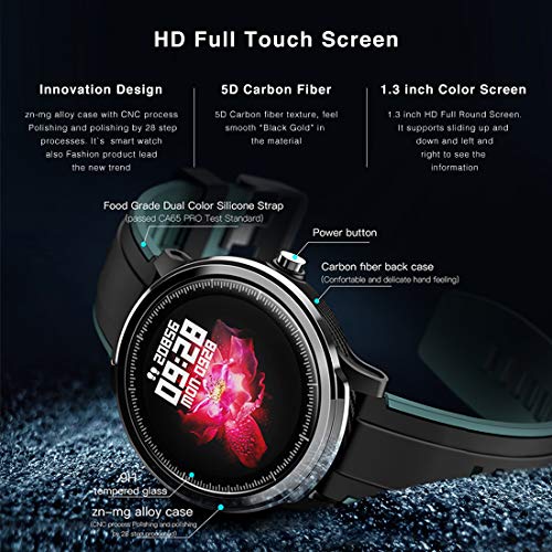 - Pantalla táctil de 1,3" y Textura de fibra de Carbono 5D ★ Podrás ver la información claramente gracias a su Display de 1.3 pulgadas táctil y en color. La agradable textura de la carcasa trasera de Fibra de Carbono hará que te sientas cómodo en todo momento. Ademas la pantalla se encenderá automáticamente cuando gires la muñeca.