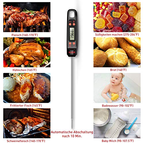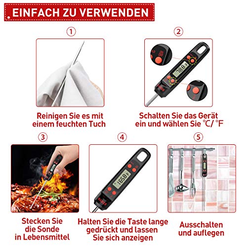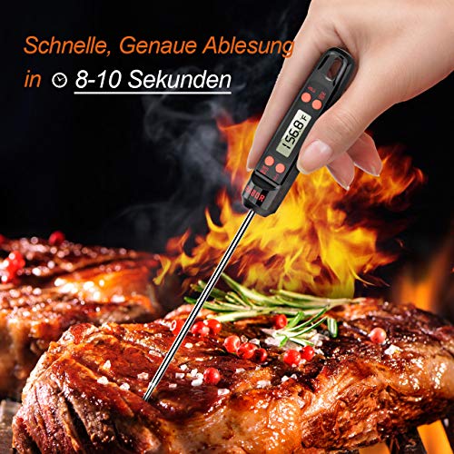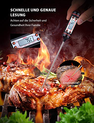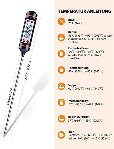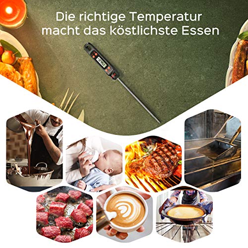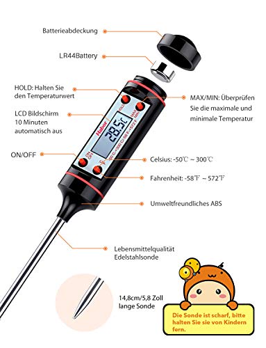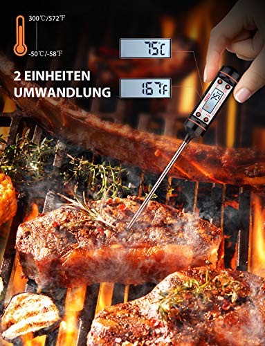 • Amplo rango: Termómetro de cocina con un rango de temperatura de -50° Celsius degree~ 300° Celsius degree , con una precisión de to +/-0.5°Celsius degree; conmutable entre Celsius/Fahrenheit; perfecto para cocinar al exterior y en el interior, para la parrilla, barbacoa, etc