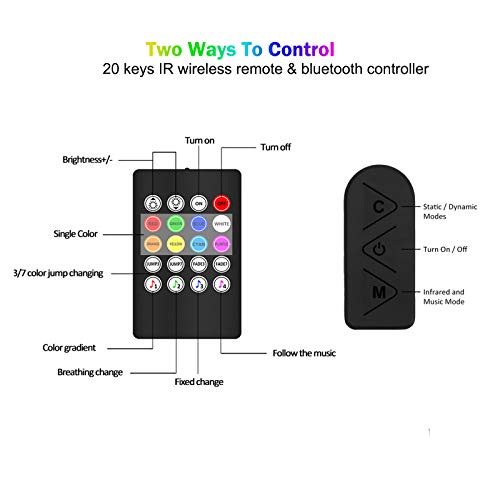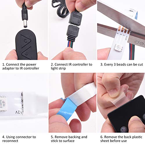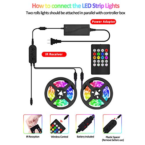 - 【Cortable y fácil instalación】 Esta tira de luz LED multicolor puede cortarse cada 3 LED a lo largo de la marca de corte sin dañar las bombillas restantes. El kit de luces de tira RGB viene con luces de cuerda de 2 * 5M, 1 * control remoto IR, 1 * caja de control, 1 * adaptador de corriente, 10 * claps y enchufes de 2 * 4 pines, el material suave permite adaptarse a cualquier patrón. Despegue la capa protectora y péguela en una superficie plana limpia y seca, luego comience a usar.