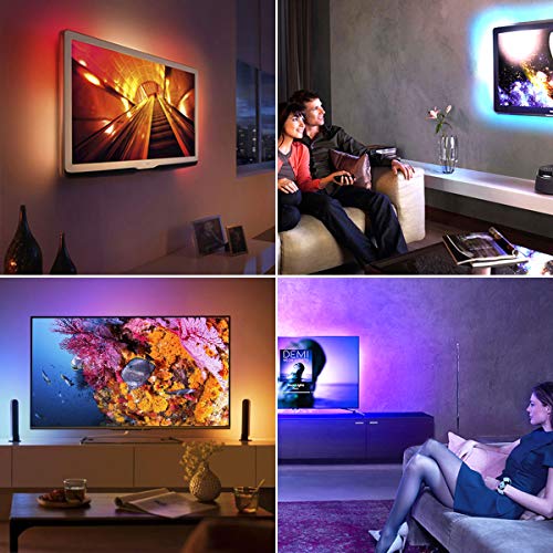 - 【Aplicación amplia】 Tenga en cuenta que NO es resistente al agua y SÓLO está diseñado para uso INTERIOR. Este kit de tiras de LED se puede usar en la sala de estar, el dormitorio, la parte posterior de su televisor o debajo del gabinete, estantería para crear una atmósfera colorida de su hogar. Olvídate del agotamiento del trabajo, deja que las luces de tira que entienden tu estado de ánimo te acompañen.