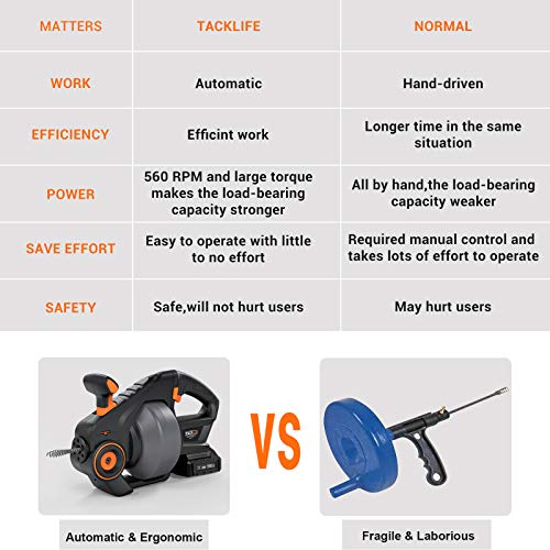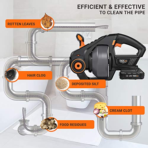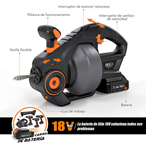Desatascador de Desagües 18V 2000mAh, TACKLIFE 0~560RPM Espiral de Limpieza con Batería...