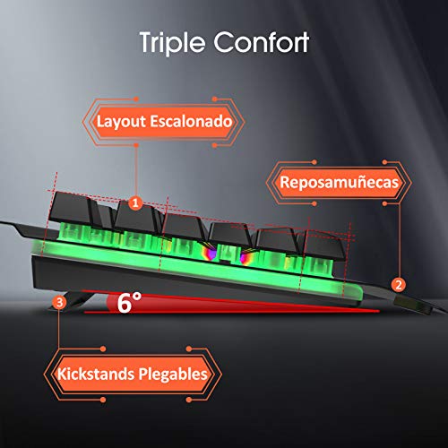 - 【Fantástica Luz de Fondo LED】Incluyendo el teclado gaming retroiluminado arco iris para juegos y el ratón gaming colorido retroiluminado LED. Teclado: 2 modos con retroiluminación para la opción, brillo ajustable y velocidad de respiración; Ratón: retroiluminación degradada de 4 colores (azul, rojo, púrpura, verde). Fantástico para los gamers.