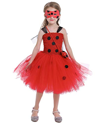 - ❥❥ TRAJES CLÁSICOS ANIMADOS: Disfraz de tutú de mariquita para niños, disfraz de superhéroe, trajes de disfraces de cosplay de carnaval de Halloween para niñas: vestido tutú de mariquita roja, máscara para los ojos y la bolsa de yo-yo.